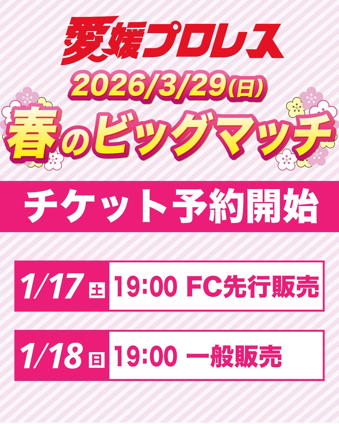 EVENT イベント詳細 日付: 2026年3月29日 カテゴリ: recommend, ビッグマッチ, 愛媛 タグ: 2026.3.29 (日) 春のビッグマッチ 日 時 2026年3月29日(日) 14:00 GONG 場 所 松山市総合コミュニティセンター 企画展示ホール チケット 【FC先行販売】 1月17日(土)19:00〜 【一般販売】 1月18日(日)19:00〜