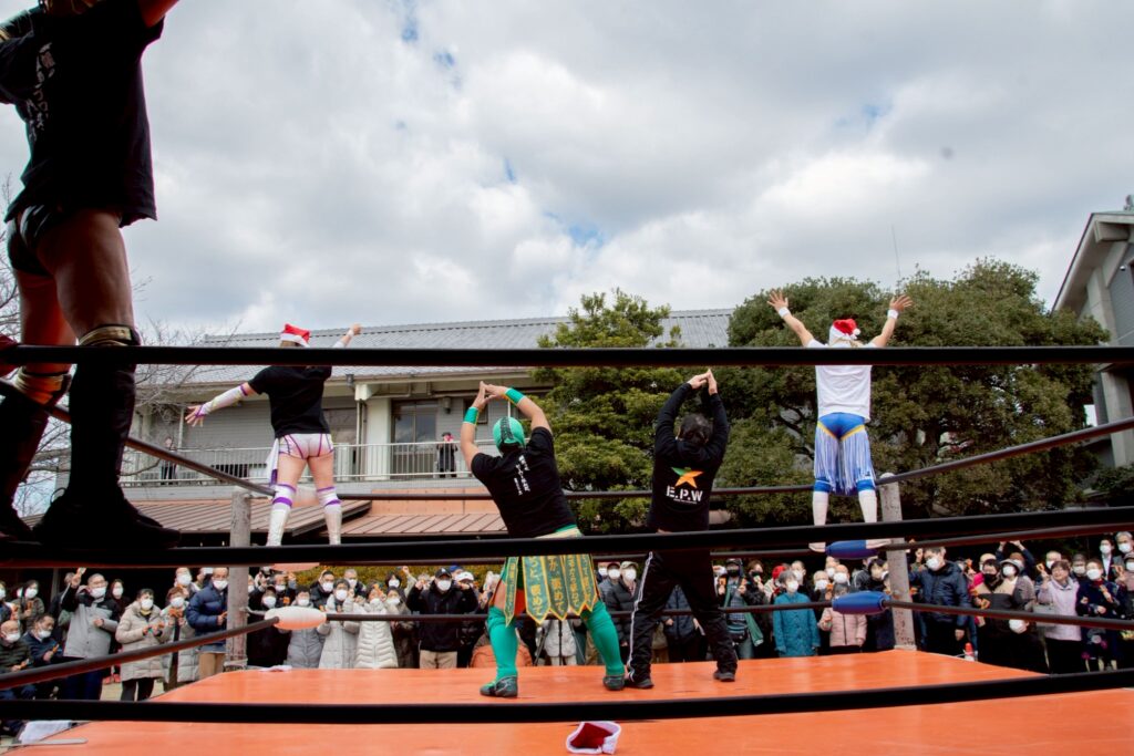 2025年12月15日 / 最終更新日時 : 2025年12月17日 webstaff NEWS 社会福祉法人いしづち会 クリスマス会でリングイベント開催‼ 年内最後リングイベント(一般観戦不可)は、寒い中も多くの利用者さまに観戦いただき、笑顔と元気をお届けすることができました‼リングイベント後はクリスマス会にレスラーも参加し、素敵な時間を過ごさせていただきました‼